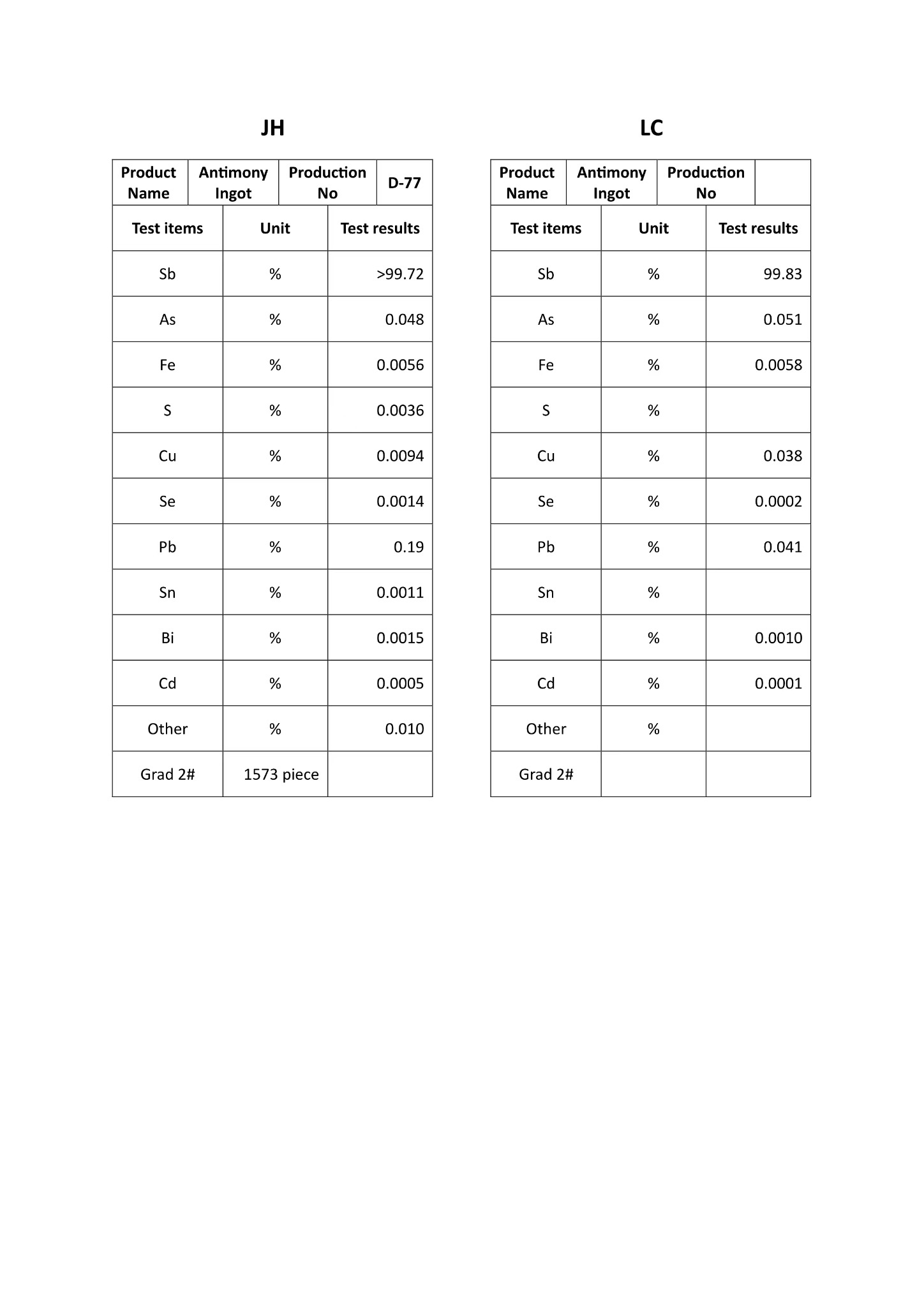 Discuss SupplyBelow is the supplier-provided product sheet image showing two sample analyses for antimony ingot lots. A more detailed specification sheet can be shared during qualified discussions.